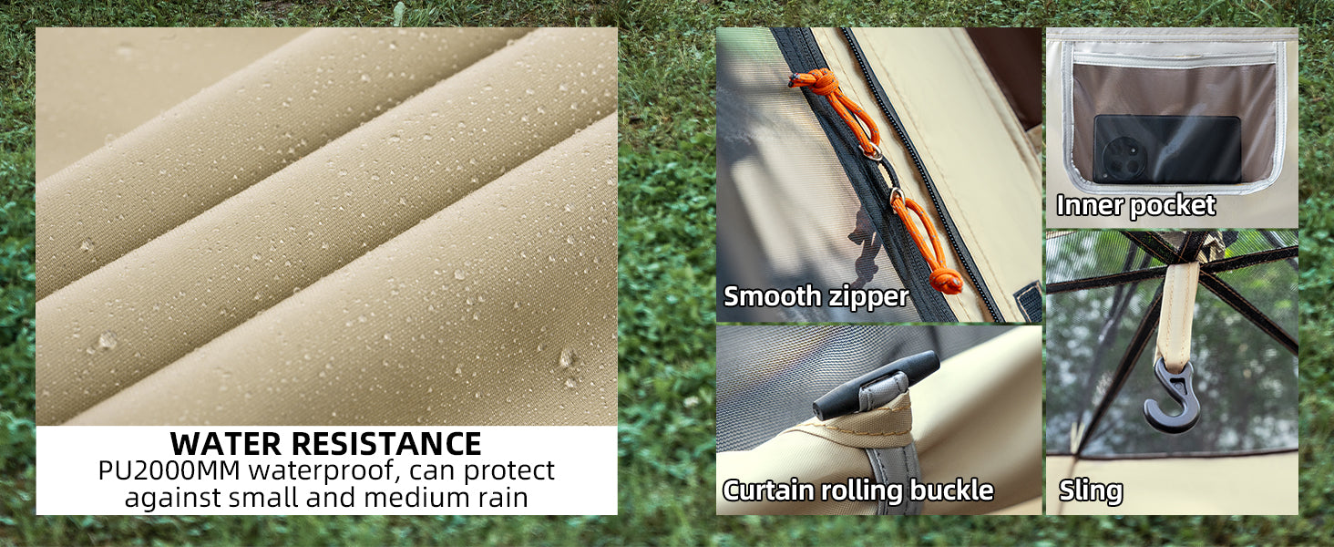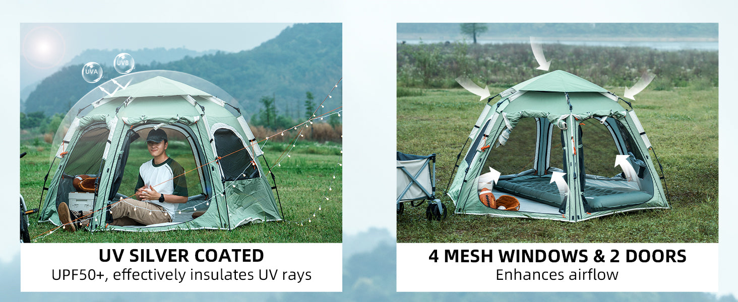 From UPF50+ sun protection to PU2000mm waterproofing, every detail is crafted for performance. Durable fiberglass poles, dual doors, and wide ventilation deliver lasting comfort wherever you camp.