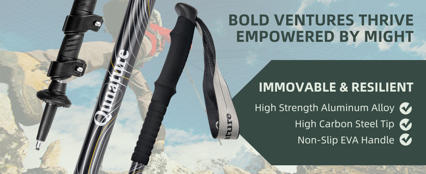 • Durable Aircraft-Grade Aluminum: Made from 6061 aircraft-grade aluminum with a reinforced carbon steel tip, this hiking pole withstands impacts and supports 70–80kg, ready for rocky trails, snow, and forest paths.