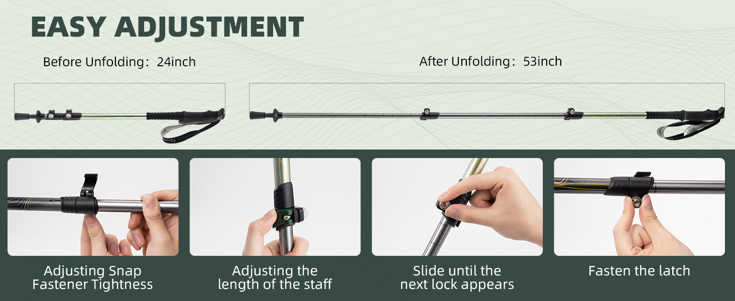 • Adjustable Telescopic Design: With a reliable 3-section telescopic system, anti-slip locking clips, and twist knobs, the trekking pole adjusts smoothly between 62–135cm to suit your height and terrain. (Do not exceed the STOP mark to avoid damage.)